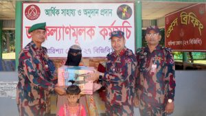 বাঘাইছড়িতে ২৭ বিজিবির মানবিক সহায়তা প্রদান প্রকাশিত: ৩:০৭ অপরাহ্ণ, ডিসেম্বর ১৪, ২০২৫ রাঙ্গামাটির বাঘাইছড়িতে সম্প্রীতি ও উন্নয়ন কর্মসূচির শিক্ষা, মানবিক সহায়তা ও সাংস্কৃতিক উন্নয়নমূলক বিভিন্ন কার্যক্রম বাস্তবায়নের লক্ষে বিভিন্ন কার্যক্রম পরিচালনা করছে বিজিবির মারিশ্যা জোন (২৭ বিজিবি) রবিবার(১৪ ডিসেম্বর) মারিশ্যা জোন সদরে জোনের দায়িত্বপূর্ণ এলাকার হালিমপুর বেসরকারী প্রাথমিক বিদ্যালয়ের শিক্ষার মান উন্নয়ন, মনোরম পরিবেশে পাঠদান নিশ্চিতকরণ এবং বিদ্যালয়ের অবকাঠামোগত উন্নয়নের লক্ষ্যে বিদ্যালয়ের সভাপতি সাধন কারবারী এর নিকট ০৫ (পাঁচ) বান টিন হস্তান্তর করা হয়, একইসাথে শিক্ষার্থীদের শারীরিক ও মানসিক বিকাশে সহায়তার জন্য ভলিবল ও নেট প্রদান করা হয়। কর্মসূচির অংশ হিসেবে মারিশ্যা জোনের দায়িত্বপূর্ণ এলাকার মধ্যমপাড়া গ্রামের দুই অসচ্ছল বাসিন্দা মোঃ হারুন মুর্শিদ ও মোঃ কাওছার -এর জীবনযাত্রার মান উন্নয়নের লক্ষ্যে দুটি করে সেলাই মেশিন বিতরণ করা হয়। এছাড়াও এলাকায় সাংস্কৃতিক বিকাশ ত্বরান্বিত করা, ঐতিহ্যবাহী পাহাড়ি সংস্কৃতি সংরক্ষণ এবং তরুণ সমাজকে সৃজনশীল কর্মকাণ্ডে উৎসাহিত করার লক্ষ্যে বাঘাইছড়ি উপজেলার উজোনী যুব শিল্পীগোষ্ঠীর নৃত্য পোশাক ক্রয়ের জন্য সংগঠনের সভাপতি শুভগত চাকমা এর নিকট ২০ হাজার টাকা আর্থিক সহায়তা প্রদান করা হয়। একই সঙ্গে খাগড়াছড়ি জেলার ইসলামপুর এলাকার মোঃ আব্দুল হালিম কে উন্নত চিকিৎসা সহায়তা হিসেবে ১০ হাজার টাকা নগদ প্রদান করা হয়। এছাড়াও বিভিন্ন শিক্ষা প্রতিষ্ঠানে আর্থিক সহায়তা প্রদান করা হয়। মারিশ্যা জোনের অধিনায়ক লেঃ কর্ণেল জাহিদুল ইসলাম জাহিদ পিএসসি বলেন বলেন, নিরাপত্তা কার্যক্রমের পাশাপাশি বিজিবি জনসাধারণের পাশে থেকে নিয়মিত জনসেবামূলক কার্যক্রম পরিচালনা করে আসছে এবং এ ধারা ভবিষ্যতেও অব্যাহত থাকবে। অনুষ্ঠানে মারিশ্যা জোনের মেডিকেল অফিসার ক্যাপ্টেন অমিত কুমার সাহা, এএমসি এবং সহকারী পরিচালক মোহাম্মদ হাফিজুর রহমান উপস্থিত ছিলেন। SHARES প্রচ্ছদ বিষয়: