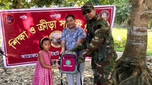 ভূয়াছড়িতে সেনাবাহিনীর শিক্ষা, ক্রীড়া উপকরণ ও চিকিৎসা সেবা প্রদান প্রকাশিত: ৬:৪৪ অপরাহ্ণ, নভেম্বর ১৪, ২০২৫ রাঙামাটি জেলার বাঘাইছড়ি উপজেলার সাজেক ইউনিয়নের ভূয়াছড়ি এলাকায় শিক্ষার্থীদের মাঝে শিক্ষা উপকরণ ও খেলাধুলার সামগ্রী বিতরণ করেছে বাংলাদেশ সেনাবাহিনী। পাশাপাশি স্থানীয়দের জন্য বিনামূল্যে চিকিৎসা সেবা প্রদান করা হয়েছে। খাগড়াছড়ি রিজিওনের আওতাধীন বাঘাইহাট জোন (১৪ ই বেঙ্গল) এর তত্ত্বাবধানে অনুষ্ঠিত এ কর্মসূচিতে শিক্ষার্থীদের মধ্যে স্কুলব্যাগ, খাতা, কলম, পেন্সিলসহ বিভিন্ন শিক্ষা উপকরণ এবং খেলাধুলার সামগ্রী প্রদান করা হয়। সেনাবাহিনী জানায়, পাহাড়ে শিক্ষার মানোন্নয়ন, খেলাধুলার প্রসার এবং স্বাস্থ্যসেবার উন্নয়নে এ ধরনের কার্যক্রম নিয়মিতভাবে অব্যাহত থাকবে। দরিদ্র পরিবারের শিক্ষার্থীদের সহায়তায় এসব উপকরণ গুরুত্বপূর্ণ ভূমিকা রাখবে বলে তারা আশা প্রকাশ করে। এ সময় ক্যাম্প কমান্ডার স্থানীয় শিক্ষক ও গণ্যমান্য ব্যক্তিদের সঙ্গে মতবিনিময় করেন এবং শিক্ষার প্রয়োজনীয়তা সম্পর্কে আলোকপাত করেন। সেনাবাহিনীর এ মানবিক উদ্যোগে স্থানীয়দের মাঝে সন্তোষজনক পরিবেশের সৃষ্টি হয়। SHARES সাজেক ইউনিয়ন বিষয়: